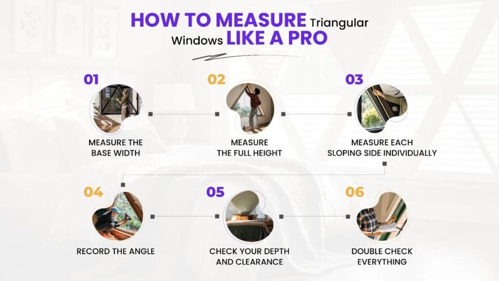 Before you even think about style or material, begin with your window itself. Take a careful measure of the full height, the width at the base and each angle on the sloping side.